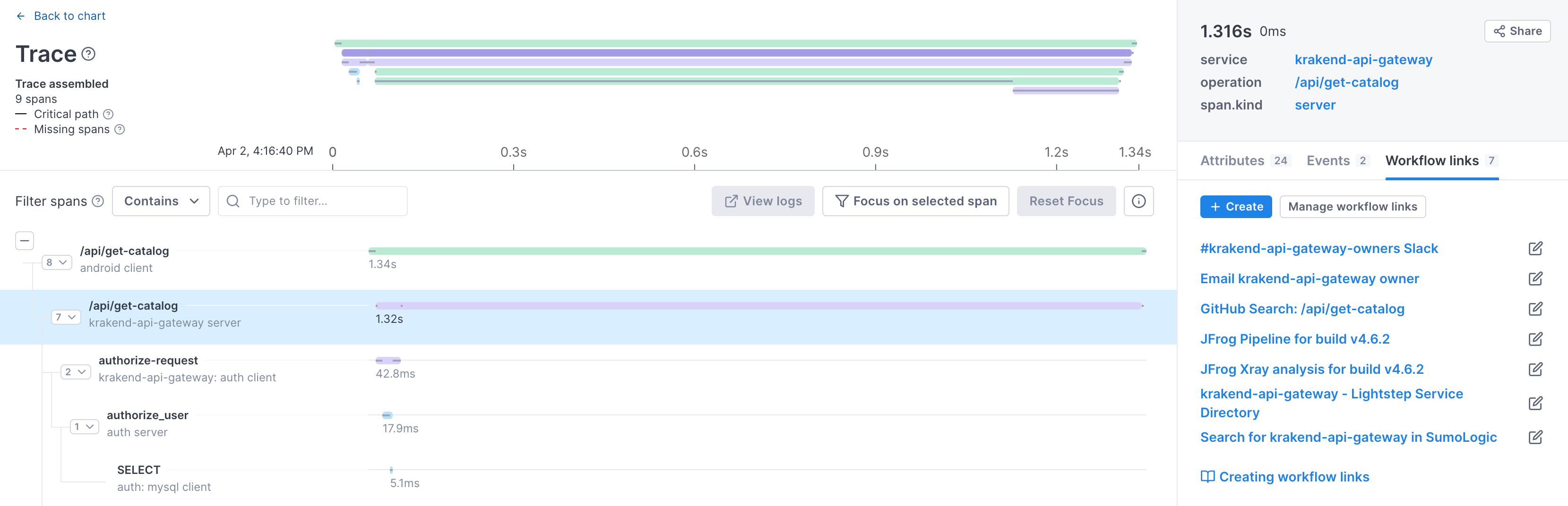 When investigating an incident or debugging a performance problem, rarely do you use just one tool or need information from just one source. You may need to jump between different tools, synthesize information from multiple sources, and notify other people quickly. Cloud Observability lets you add flexible Workflow Links on the Trace View page that link to other resources, allowing access to all the info you need when you need it.