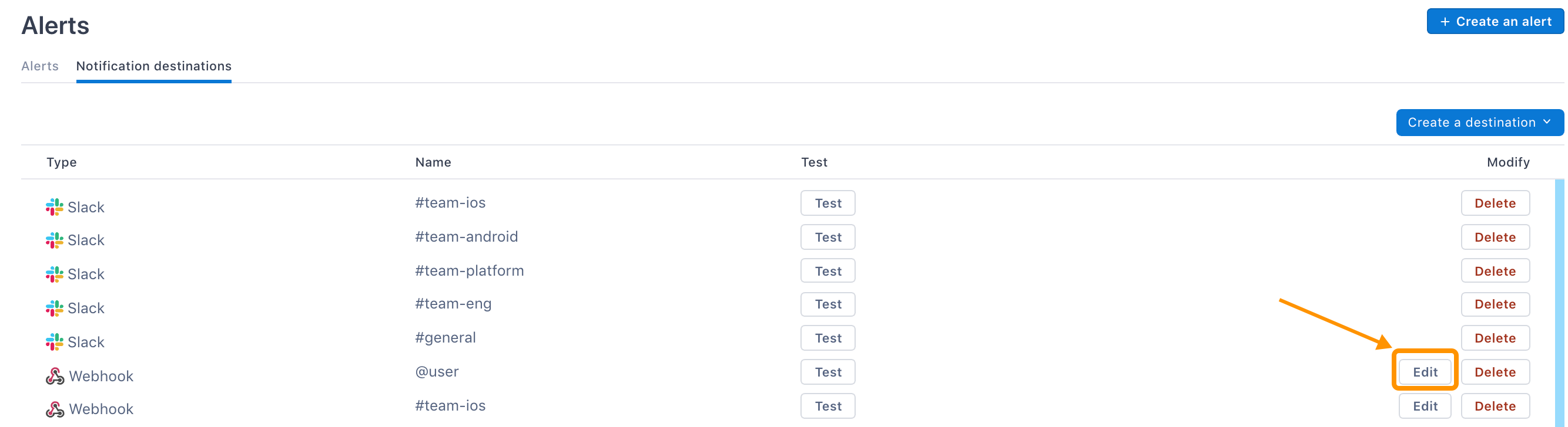 From the navigation bar, click Alerts and click the Notification destinations tab.